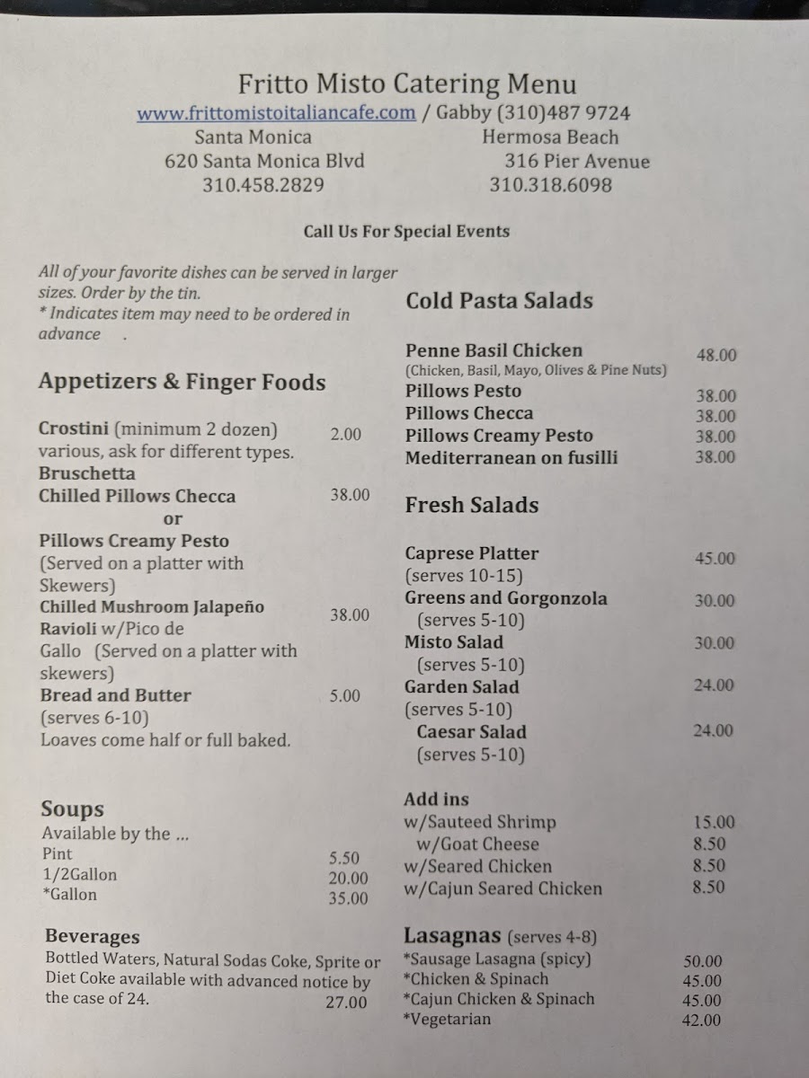 Welcome to Fritto Misto, a delightful Italian restaurant nestled in the heart of Hermosa Beach. Known for its homemade pasta specialties, this culinary gem offers an eclectic menu that bursts with flavor and creativity. Highlights include the Atomic Pasta, featuring Cajun seared chicken on a bed of New Mexico chili linguini, and the Artichoke Gnocchi with Shrimp, perfectly tossed in a chardonnay lemon sage cream that will tantalize your taste buds.