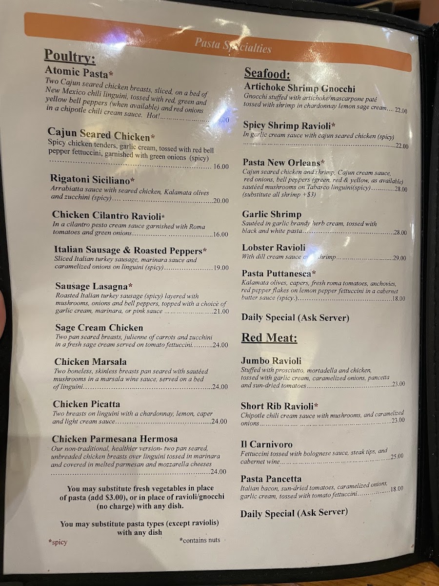 2 Cajun seared chicken breasts, sliced, on a bed of New Mexico chili linguini, tossed with red, green, and yellow bell peppers (when available) and red onions in a chipotle chili cream sauce. Hot.